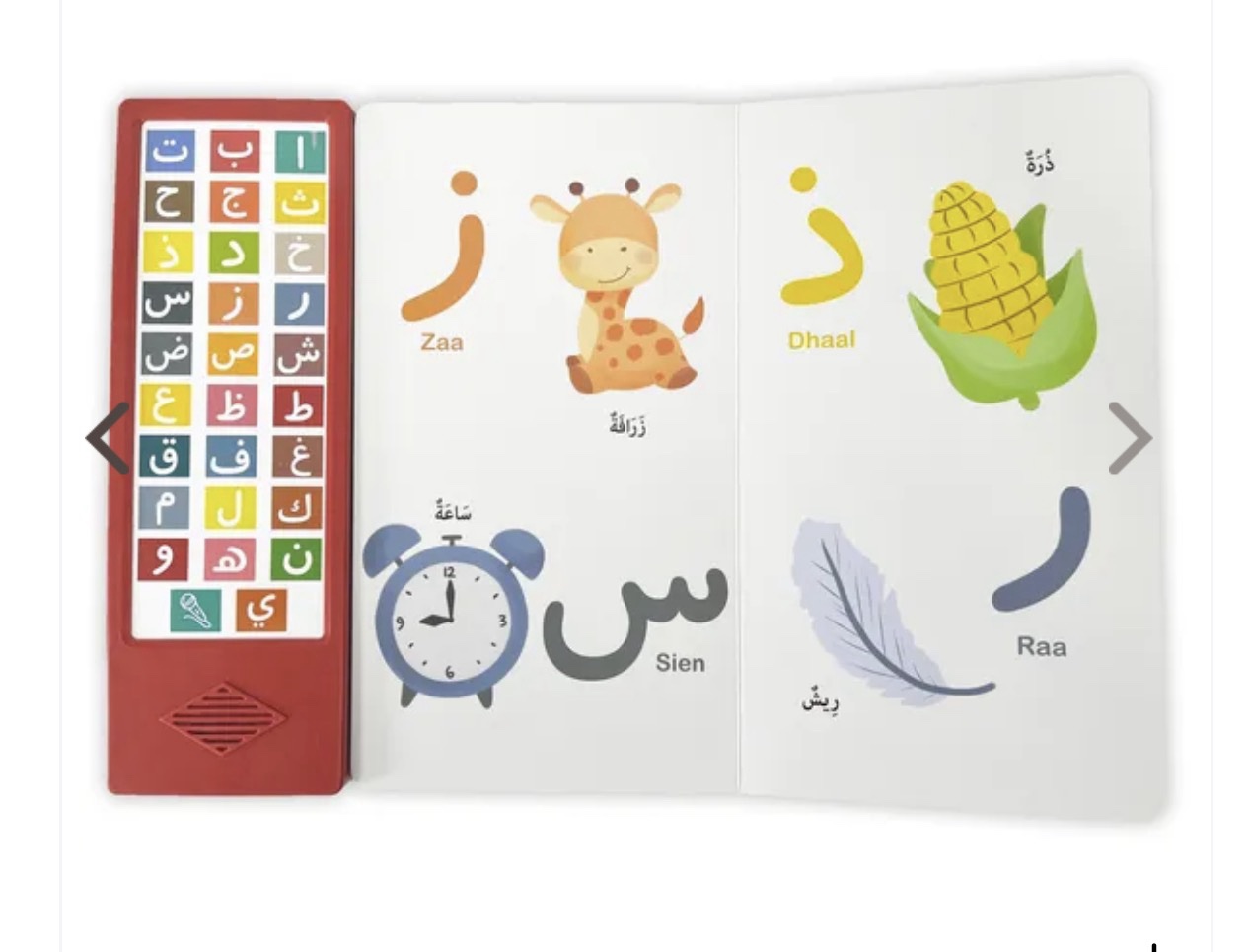 Met dit vrolijke geluidsboek maken kinderen op een speelse manier kennis met het Arabische alfabet. Elke letter komt tot leven met kleurrijke illustraties en heldere klanken. Druk op de knoppen om de juiste uitspraak te horen. Ideaal voor kleine ontdekkers die leren en plezier willen combineren. Een interactieve en leuke manier om het Arabische alfabet te ontdekken!