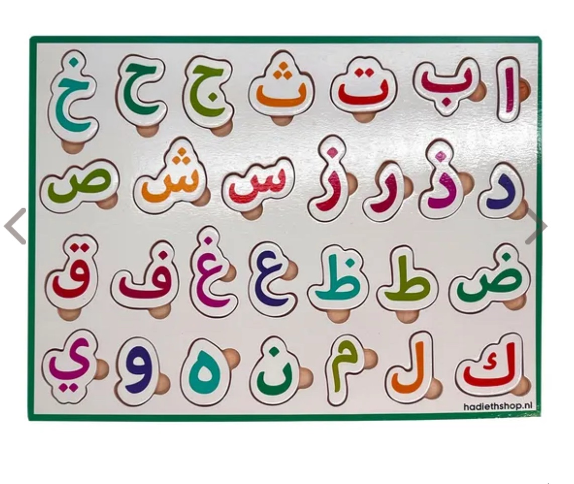 Ontdek het alfabet op een speelse en leuke manier! Met deze houten puzzel in vrolijke kleuren leren kinderen spelenderwijs het Arabische alfabet en ontwikkelen ze hun fijne motoriek. De puzzel is van hoogwaardige kwaliteit voor eindeloos speelplezier.