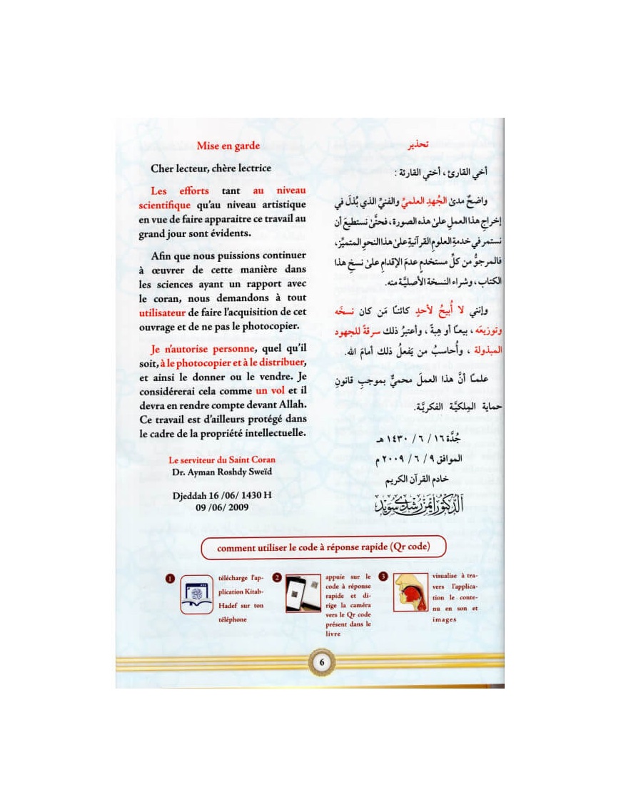Pour une meilleure utilité pour les écoles et instituts de Coran, j’ai accompagné ce livre de LIEN QR CODE contenant tous les croquis ainsi que des images animées afin de mettre en valeur les sons et ce qui se produit à l’intérieur de la bouche lors de la prononciation des lettres. Ce travail n’aurait pu être accompli de cette manière sans l’aide d’Allah puis sans les précieux efforts de mon cher frère le grand professeur Taysîr al‘Arnad qu’Allah le préserve et augmente la communauté de ses semblables. Il a mis au service de ce travail tout son savoir de la calligraphie, du dessin et des croquis ainsi que son goût artistique lui permettant de matérialiser des concepts que je ne savais comment décrire étant donné que cela se produisait à l’intérieur de la bouche. Taysîr al‘Arnad – qu’Allah le préserve- a su les reproduire sous forme de dessins et d’images animées mettant en valeur des règles difficilement explicables.