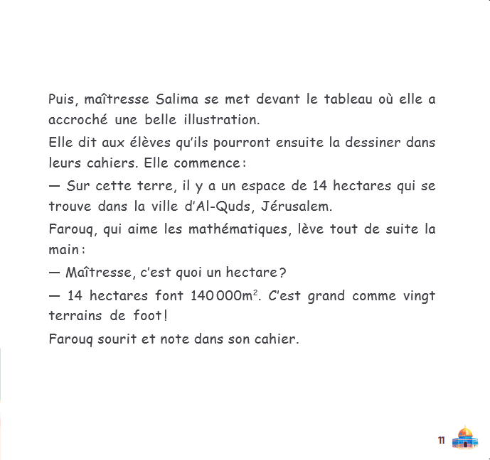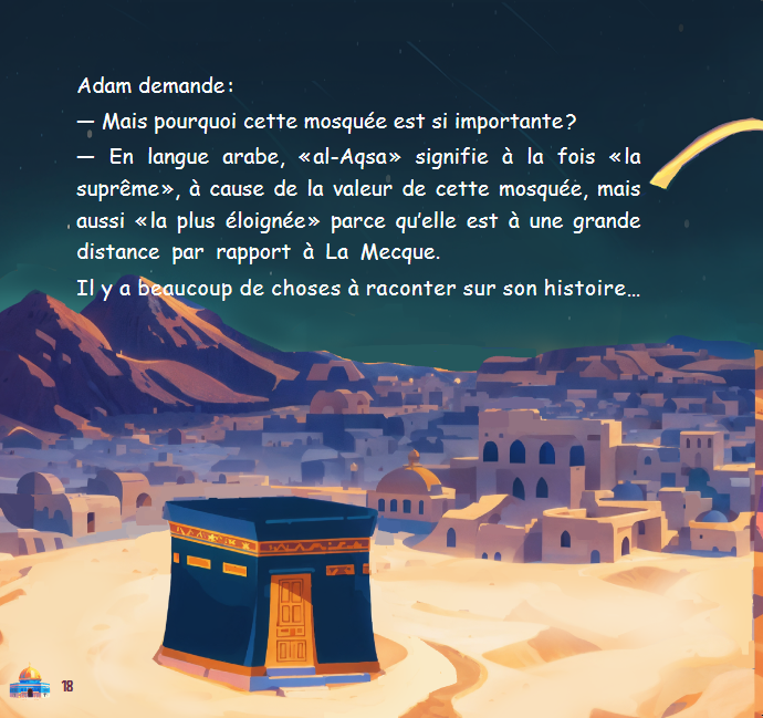A travers ce récit, le petit lecteur va visualiser les lieux. De plus, il aura une mise au point sur ce qu’est réellement l’esplanade sacrée. En effet, beaucoup pensent qu’elle n’est que le Dôme du Rocher. Mais, ce n’est pas le cas. Aussi, le lecteur apprendra son histoire. Et, ainsi à quoi correspond chaque mosquée qui compose cette esplanade.