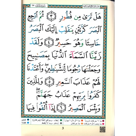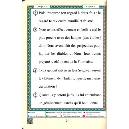Grâce au système innovant de Tajwid en couleurs, les règles de récitation sont clairement mises en évidence, permettant aussi bien aux débutants qu’aux lecteurs avancés d’améliorer leur prononciation et leur fluidité.