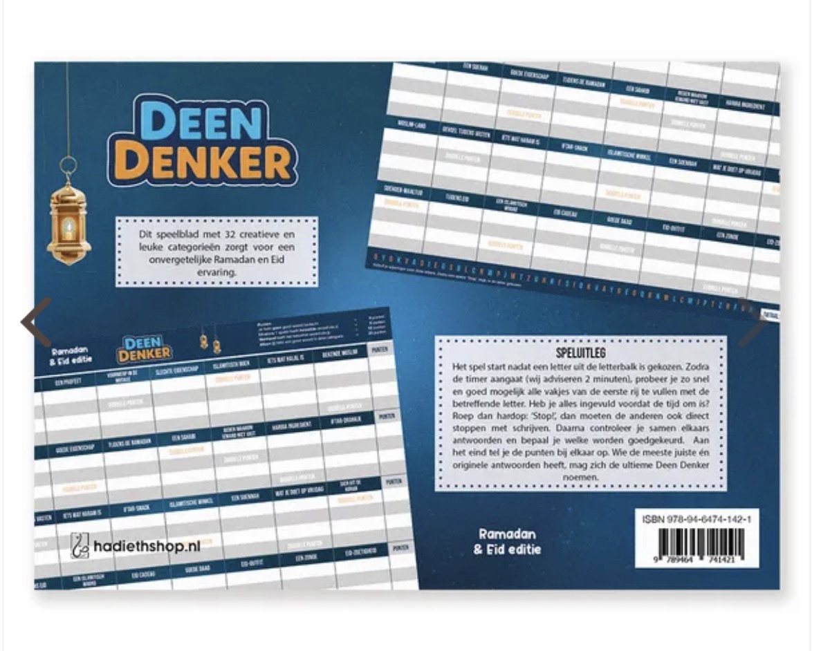 Deen Denker: Ramadan & Eid Editie is een leuk en leerzaam kennisspel waarin spelers hun creativiteit én kennis over Ramadan en Eid inzetten. Het spel bevat 32 verrassende categorieën. Zodra de letter gekozen is, probeert iedereen binnen 2 minuten alle categorieën op zijn speelblad in te vullen.