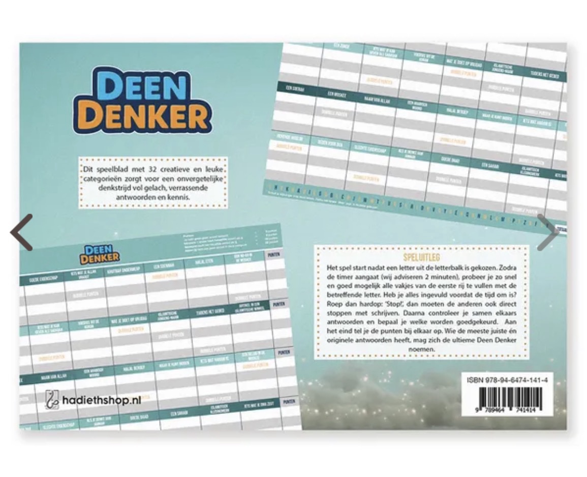 Deen Denker is een leuk en leerzaam kennisspel waarin spelers hun creativiteit én islamitische kennis inzetten. Het spel bevat 32 leuke en verrassende categorieën. Zodra de letter gekozen is, probeert iedereen binnen 2 minuten alle categorieën op zijn speelblad in te vullen.