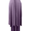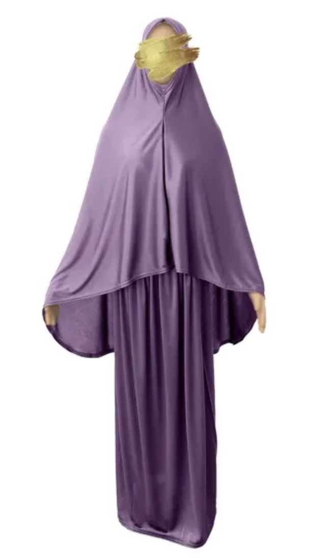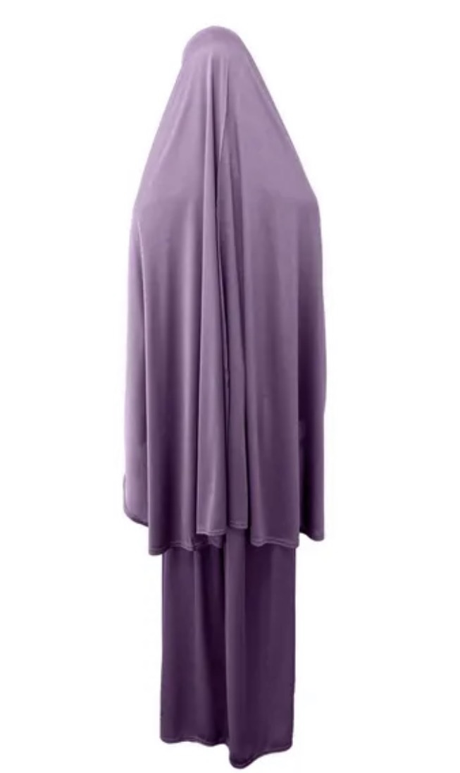 Onze gebedskleding bestaat uit een tweedelig setje in mauve, bestaande uit een Khimar en een rok in stretchstof. De Khimar hoef je niet vast te binden maar kun je gewoon over je hoofd aantrekken. Het setje is niet alleen geschikt voor het gebed maar ook als je snel iets aan moet doen omdat er iemand aan de deur belt of je even de tuin in moet. De set is gemaakt van fijne, zachte stretchstof.