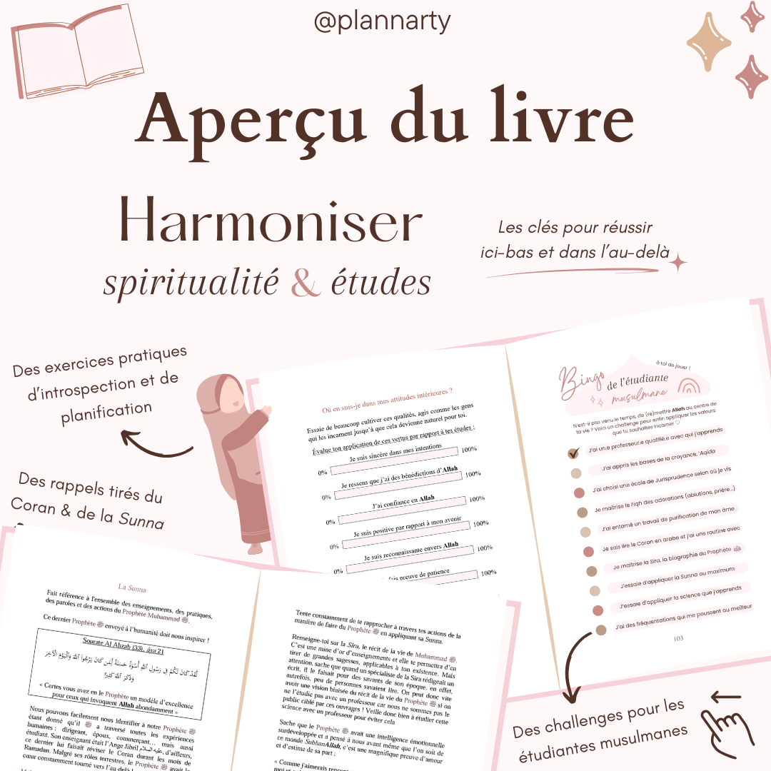Ma sœur, imagine une vie où ta foi et tes études s’harmonisent, où tes études deviennent une cause pour te rapprocher d’Allah. Mon livre le livre « Harmoniser spiritualité et études : Les clés pour réussir ici-bas et dans l’au-delà » te permet de révéler les clés pour atteindre la félicité ici-bas et dans l’au-delà biidhnillah !
