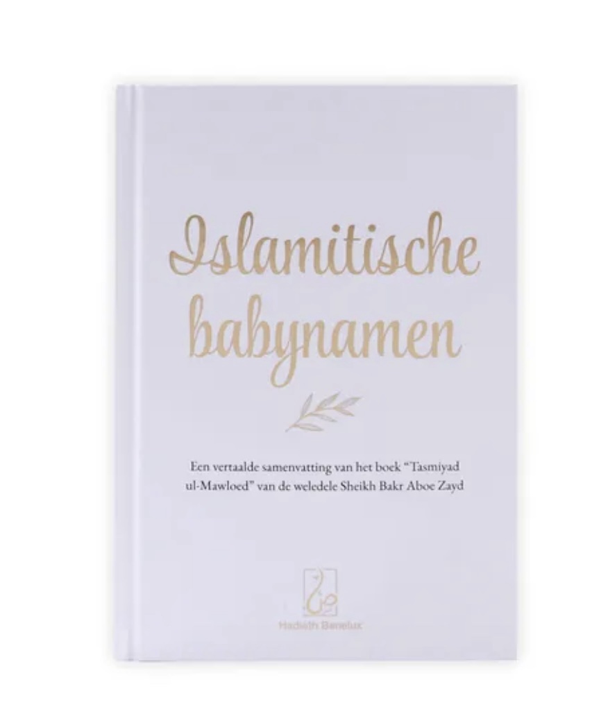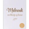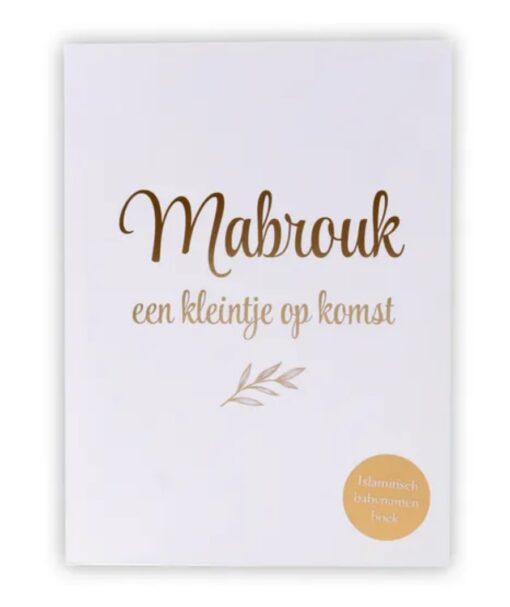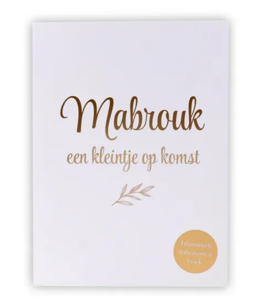 Het boek ‘Islamitische babyamen’ in een mooie giftbox met de tekst: ‘Mabrouk, een kleintje op komst.’