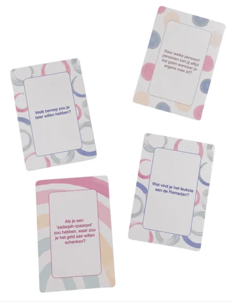 Voer leuke en grappigegesprekken met onze islamitische gesprekskaarten voor kinderen! Perfect voor leeftijden 5 tot 12 jaar, speel met je familie, vrienden of met je klas. Ontdek grappige verhalen, droom over avonturen, en leer elkaar beter kennen. Deze kaarten bieden een geweldige manier om plezier te hebben en tegelijkertijd te leren over de islam. Ideaal voor thuis of op school.