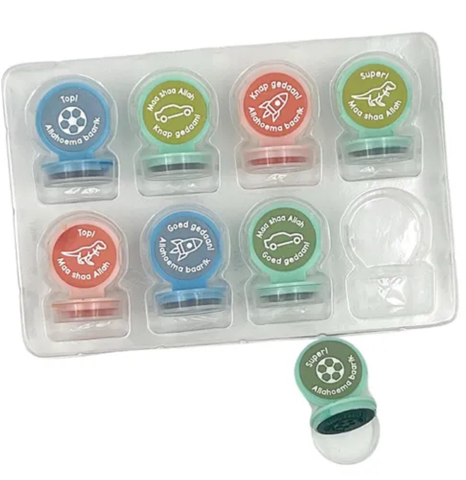 Breng een lach op het gezicht van kleine moslims met onze Islamitische Beloningsstempels! Deze set van 8 stempels bevat vrolijke ontwerpen en aanmoedigende berichten.