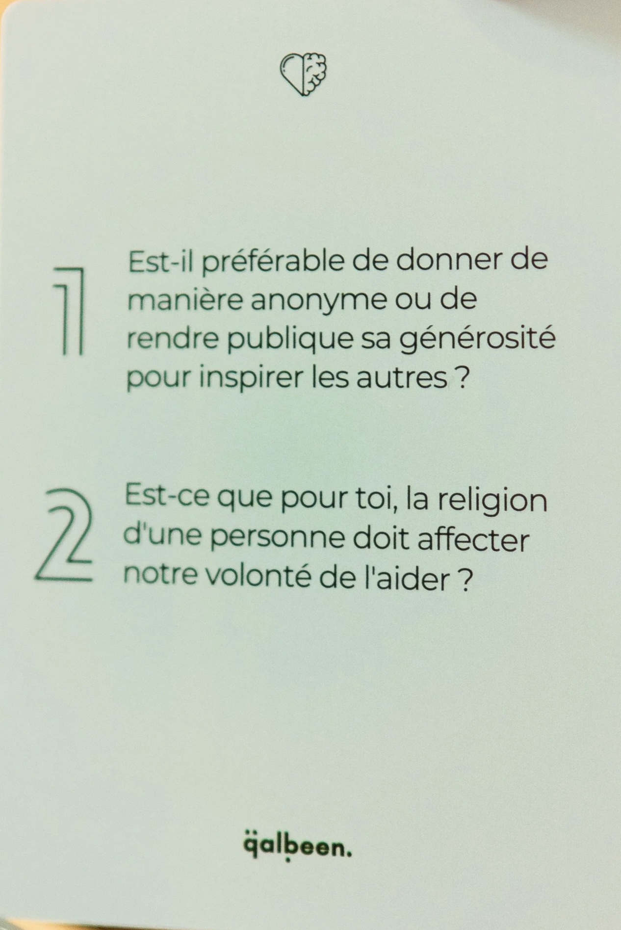 À l’intérieur de cette boîte, vous trouverez 158 questions. Piochez une carte, lisez la question et partagez votre réflexion. Discutez-en ensemble, puis passez-la à la personne suivante.