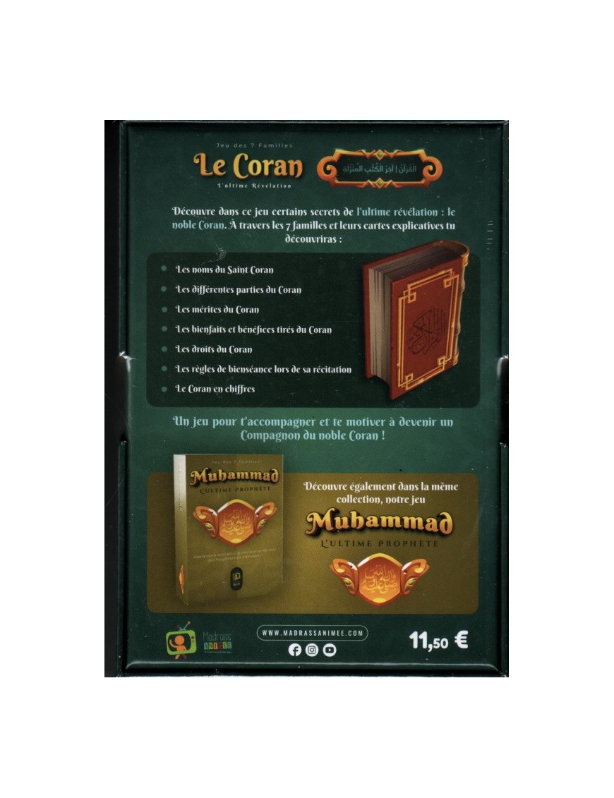 Découvre dans ce jeu certains secrets de l’ultime révélation : le noble Coran. À travers les 7 familles et leurs cartes explicatives, tu découvriras :