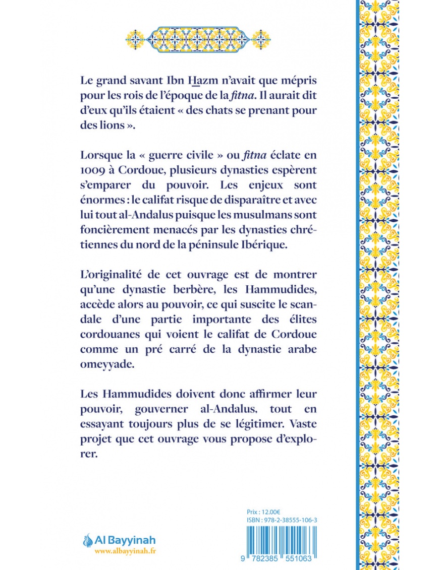 Ce livre met en lumière les enjeux politiques, religieux et symboliques de la légitimité califale à une époque de profondes mutations. Les trois premiers souverains hammudides – ‘Ali ibn Hammud, al-Qasim et Yahya ibn ‘Ali – se sont succédé dans un contexte marqué par les luttes de pouvoir et la fragmentation du califat omeyyade.