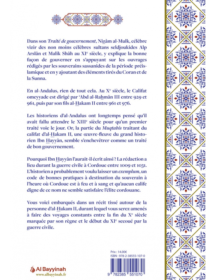 En al-Andalus, rien de tout cela. Au Xe siècle, le Califat omeyyade est dirigé par ‘Abd al-Rahmân III entre 929 et 961, puis par son fils al-Hakam II entre 961 et 976. Les historiens d’al-Andalus ont longtemps pensé qu’il avait fallu attendre le XIIIe siècle pour qu’un premier traité voie le jour. Or, la partie du Muqtabis traitant du califat d’al-Hakam II, une œuvre-fleuve du grand historien Ibn Hayyân, semble s’enchevêtrer comme un traité de bon gouvernement.