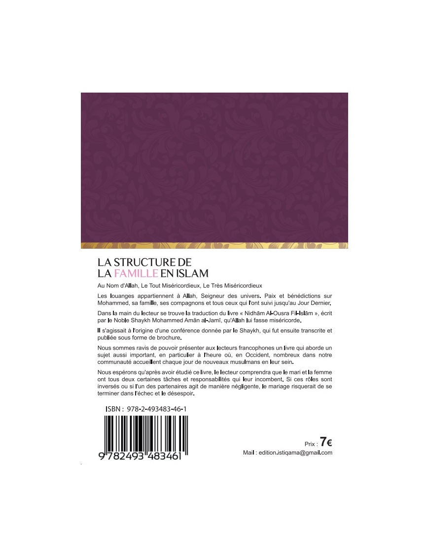 Dans la main du lecteur se trouve la traduction du livre « nidham al ousra fil islam » , écrit par le Noble Shaykh Mohammed Aman al-Jamï, qu’Allah lui fasse miséricorde.