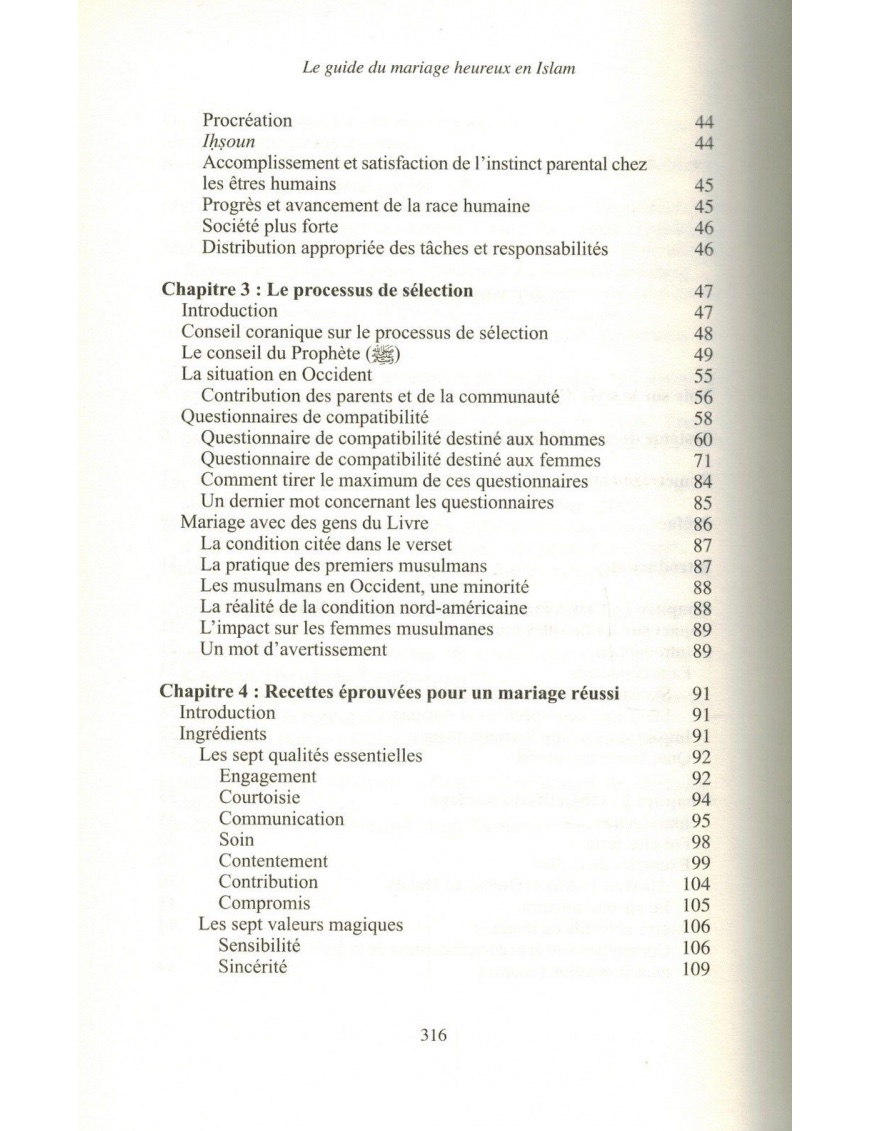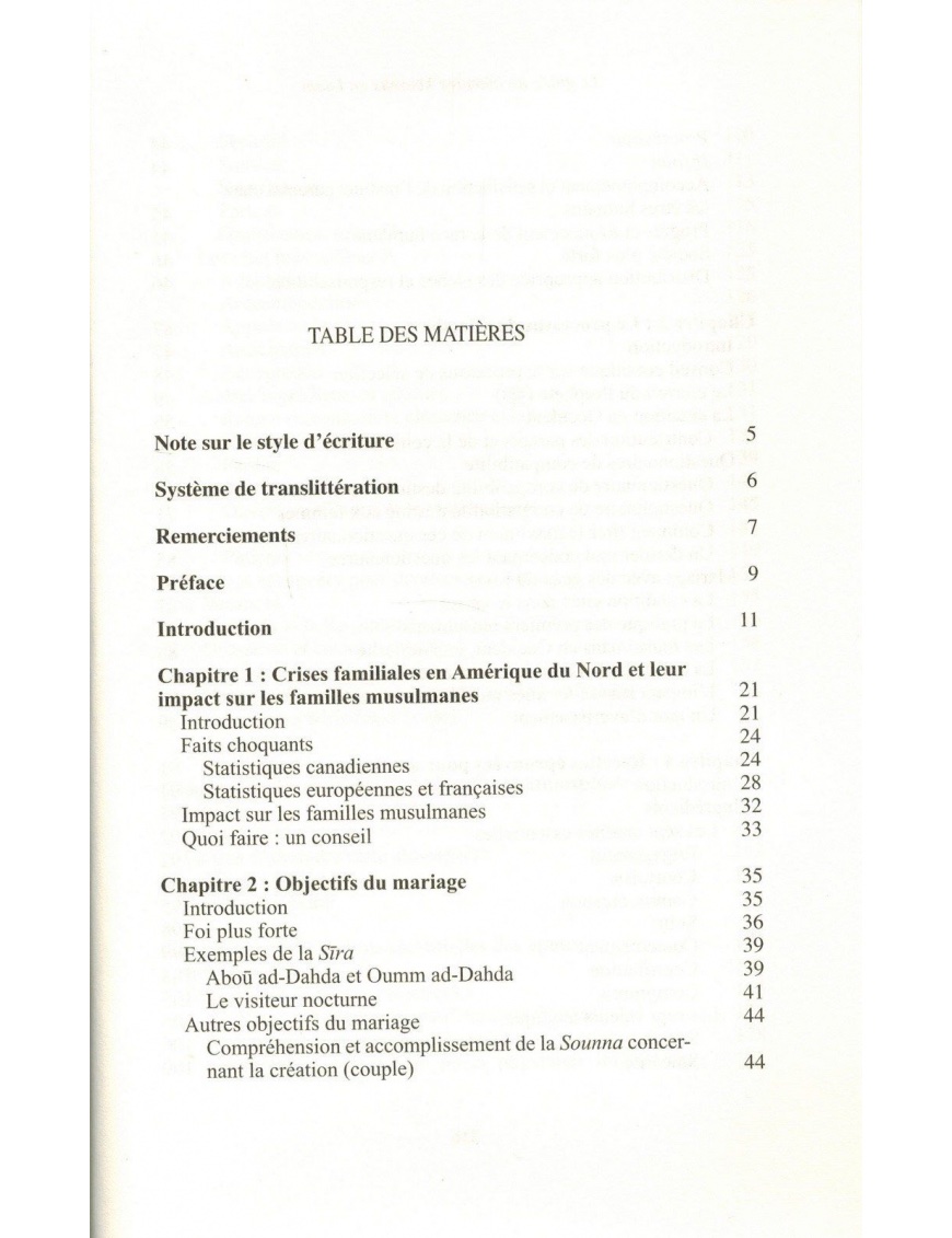 Des recommandations testées et éprouvées pour la recherche et la sélection des époux sont proposées. Un grand nombre d’exemples de la vie quotidienne, et d’autres concernant des aspects auxquels les familles musulmanes font face en Occident sont discutés. On trouve également détaillées les qualités essentielles pour une harmonie réussie dans le couple. Enfin, des études de cas présentent des problèmes courants auxquels doivent faire face les époux aux différents stades de leur mariage. Des analyses et des solutions sont proposées comme résolution de ces problèmes.