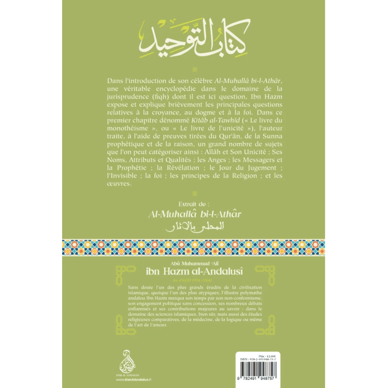 Dans l’introduction de son célèbre Al-Muhallâ bi-l-Athâr, une véritable encyclopédie dans le domaine de la jurisprudence (fiqh) dont il est ici question, Ibn Hazm expose et explique brièvement les principales questions relatives à la croyance, au dogme et à la foi. Dans ce premier chapitre dénommé Kitâb al-Tawhîd (« Le livre du monothéisme », ou « Le livre de l’unicité »), l’auteur traite, à l’aide de preuves tirées du Qur’ân, de la Sunna prophétique et de la raison, un grand nombre de sujets que l’on peut catégoriser ainsi : Allâh et Son Unicité ; Ses Noms, Attributs et Qualités ; les Anges ; les Messagers et la Prophétie ; la Révélation ; le Jour du Jugement ; l’Invisible ; la foi ; les principes de la Religion ; et les œuvres.