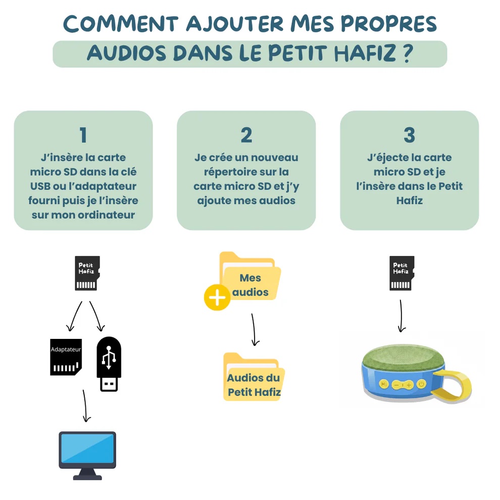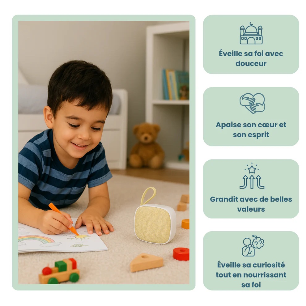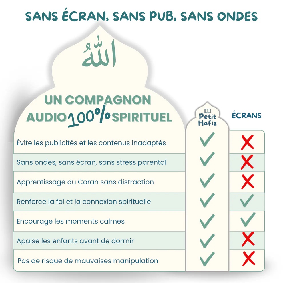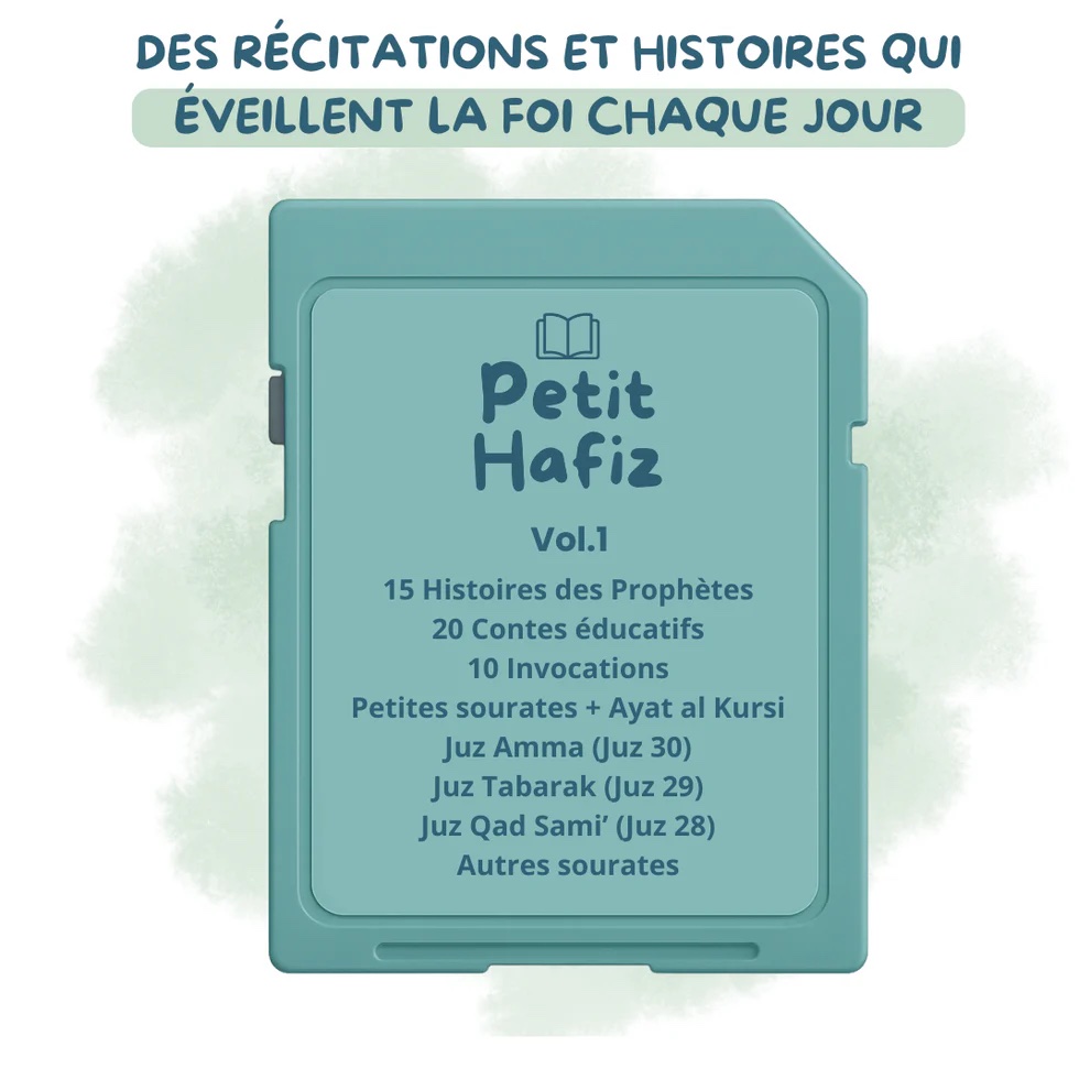 Le Lecteur Petits Hafiz est un dispositif éducatif audiophonique conçu pour initier les enfants à l’écoute et à l’apprentissage du Coran, grâce à des récitations lentes, des histoires des Prophètes et des duas protectrices à réciter en famille.
