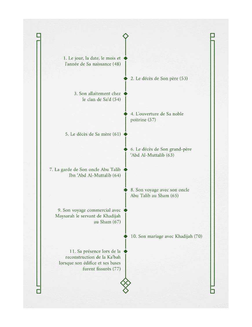 Le livre ne s’arrête pas au poème. En effet, une frise chronologique simplifie la visualisation des événements majeurs de la vie du prophète ﷺ dans leur ordre historique. Ce repère visuel aide énormément à situer les moments clés et à comprendre la progression de la Révélation.