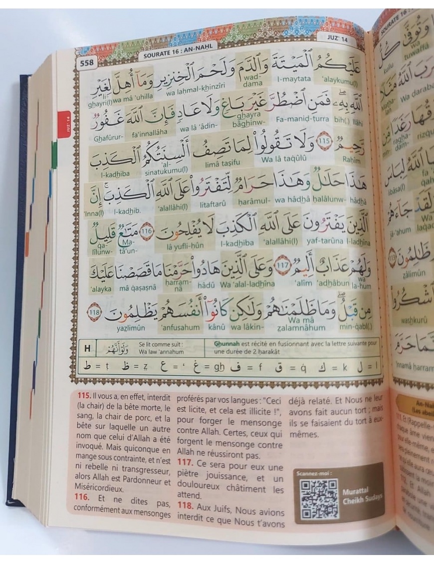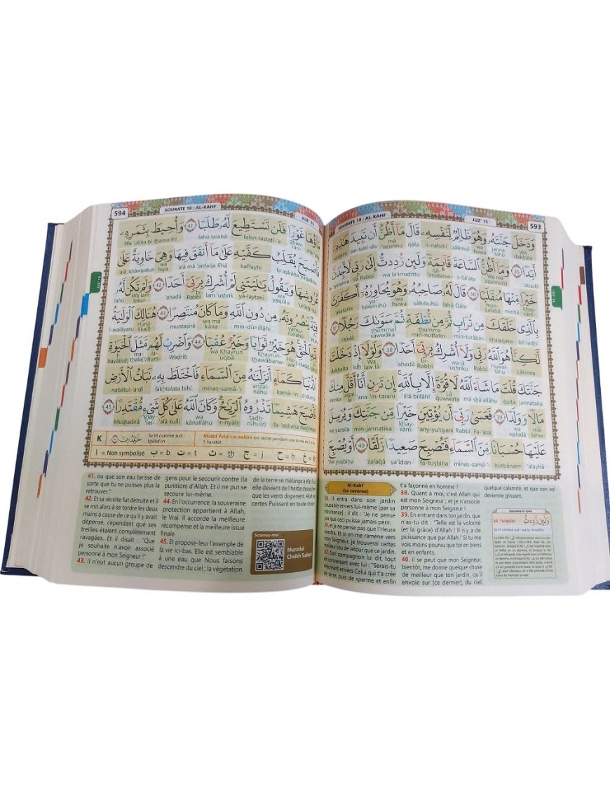 Les règles de tajwid sont données par un système de couleur intuitif pour apprendre les règles de lecture et de psalmodie du Saint Coran et le code QR (présent sur chaque page) permet d’ouvrir une vidéo sur son smartphone et d’écouter et suivre la lecture du Coran par cheikh Soudays.