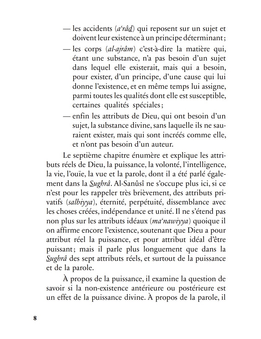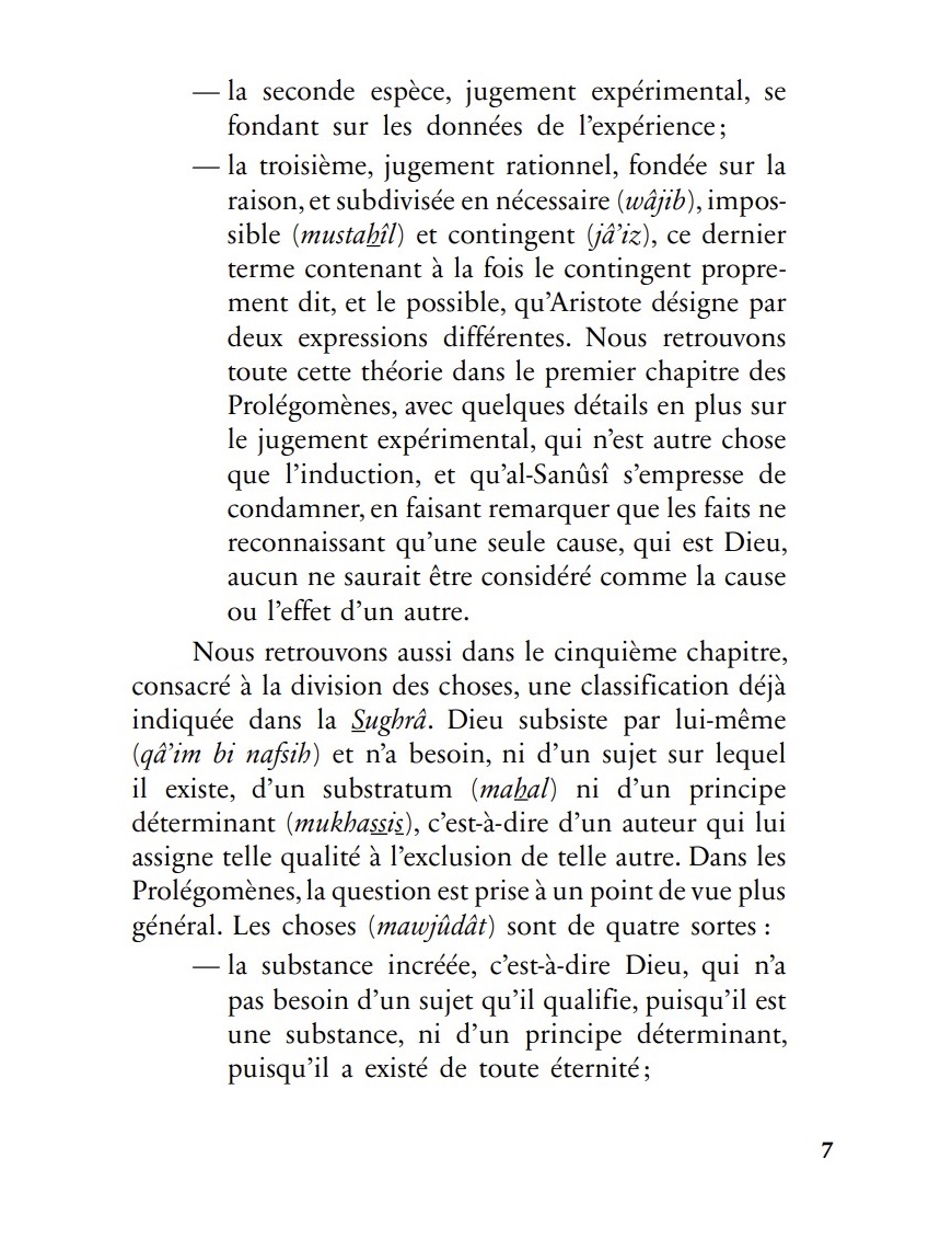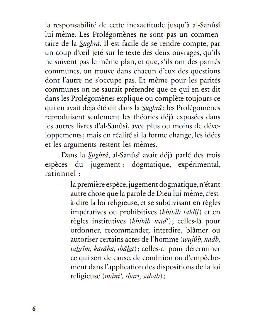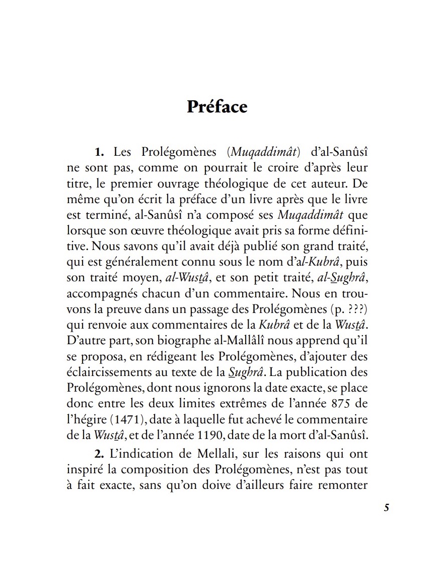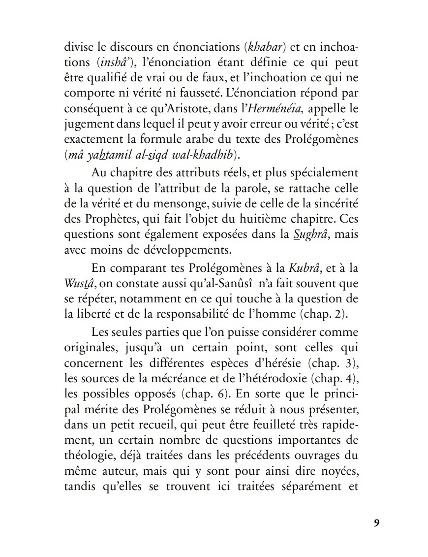 « Les Prolégomènes théologiques d’al-Sanûsî sont aujourd’hui peu connus parmi les lettrés musulmans, et assurément leur notoriété n’a jamais égalé celle des deux principaux ouvrages du même auteur, la Kubrâ et la Sughrâ…