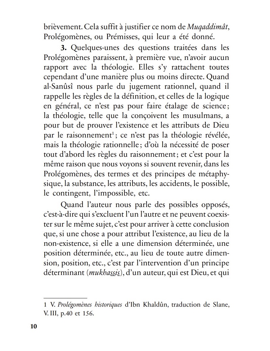 Mais si on considère l’époque et le milieu où vivait al-Sanûsî, Les Prolégomènes constituent un travail important. Ils ont en outre pour nous un intérêt documentaire incontestable, en ce qu’ils contribuent à nous renseigner sur le degré des connaissances que l’on possédait dans le nord de l’Afrique au XVe siècle, ainsi que sur l’esprit de l’enseignement qui s’y donnait. »