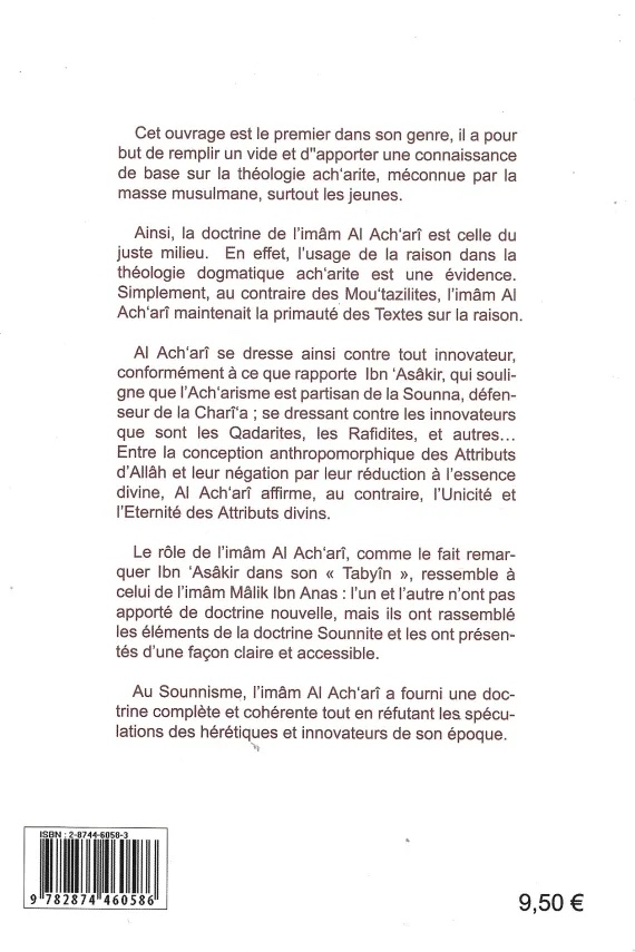 Cet ouvrage est le premier dans son genre, il a pour but de remplir un vide et d’apporter une connaissance de base sur la théologie ach’arite, méconnue par la masse musulmane, surtout les jeunes.