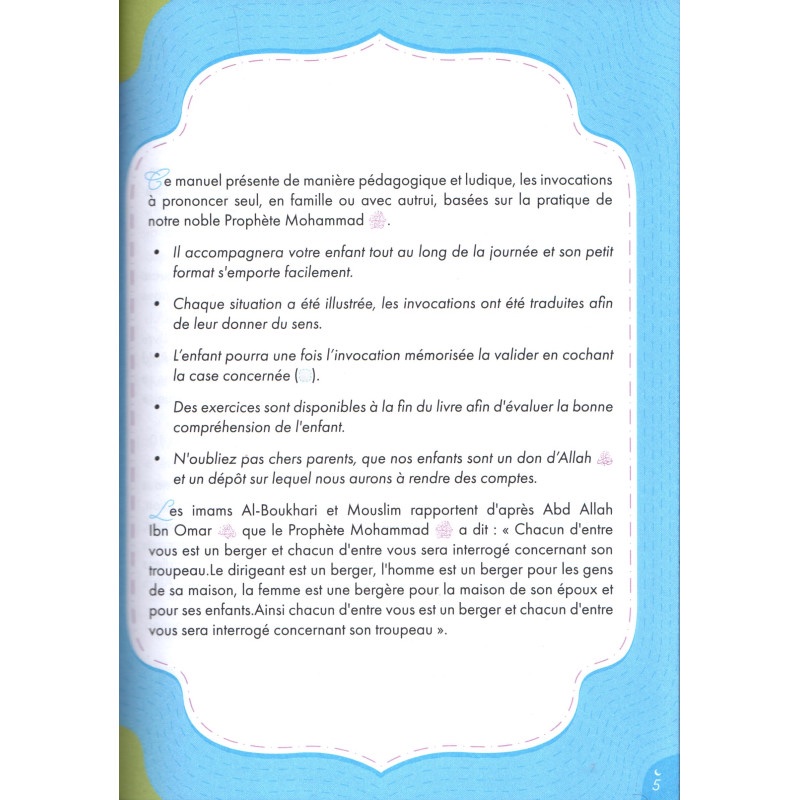Ce manuel présente de manière pédagogique et ludique les invocations à prononcer seul, en famille ou avec autrui, basées sur la pratique de notre noble Prophète Mohammad.