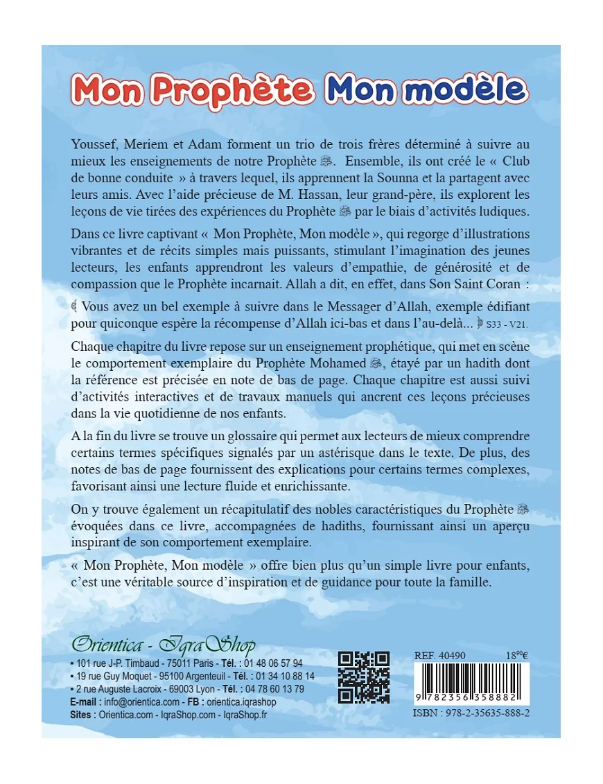 [ Vous avez un bel exemple à suivre dans le Messager d’Allah, exemple édifiant pour quiconque espère la récompense d’Allah ici-bas et dans l’au-delà… ] S33 – V21.Chaque chapitre du livre repose sur un enseignement prophétique, qui met en scène le comportement exemplaire du Prophète Mohamed ﷺ, étayé par un hadith dont la référence est précisée en note de bas de page. Chaque chapitre est aussi suivi d’activités interactives et de travaux manuels qui ancrent ces leçons précieuses dans la vie quotidienne de nos enfants.