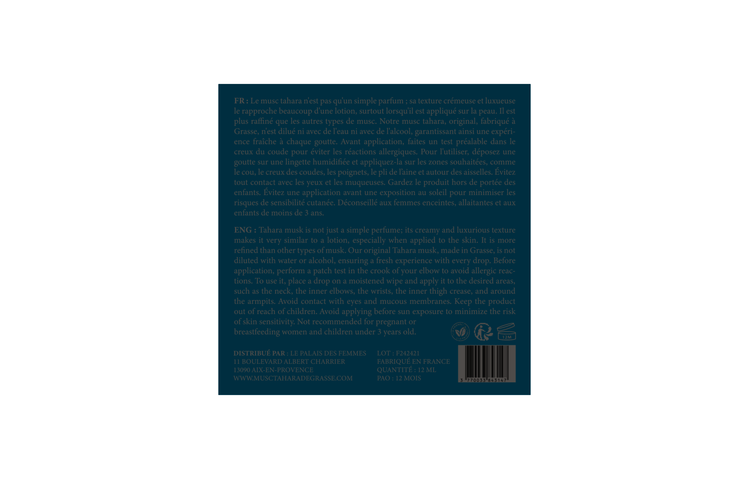 Livré dans un coffret d’exception avec une fiole en verre, le Musc Tahara Intime allie modernité et intemporalité dans un design épuré.