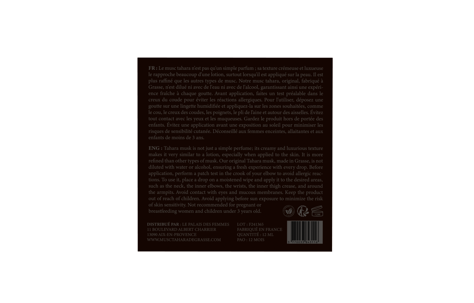 Livré dans un coffret d’exception avec une fiole en verre, le Musc Tahara Intime allie modernité et intemporalité dans un design épuré.