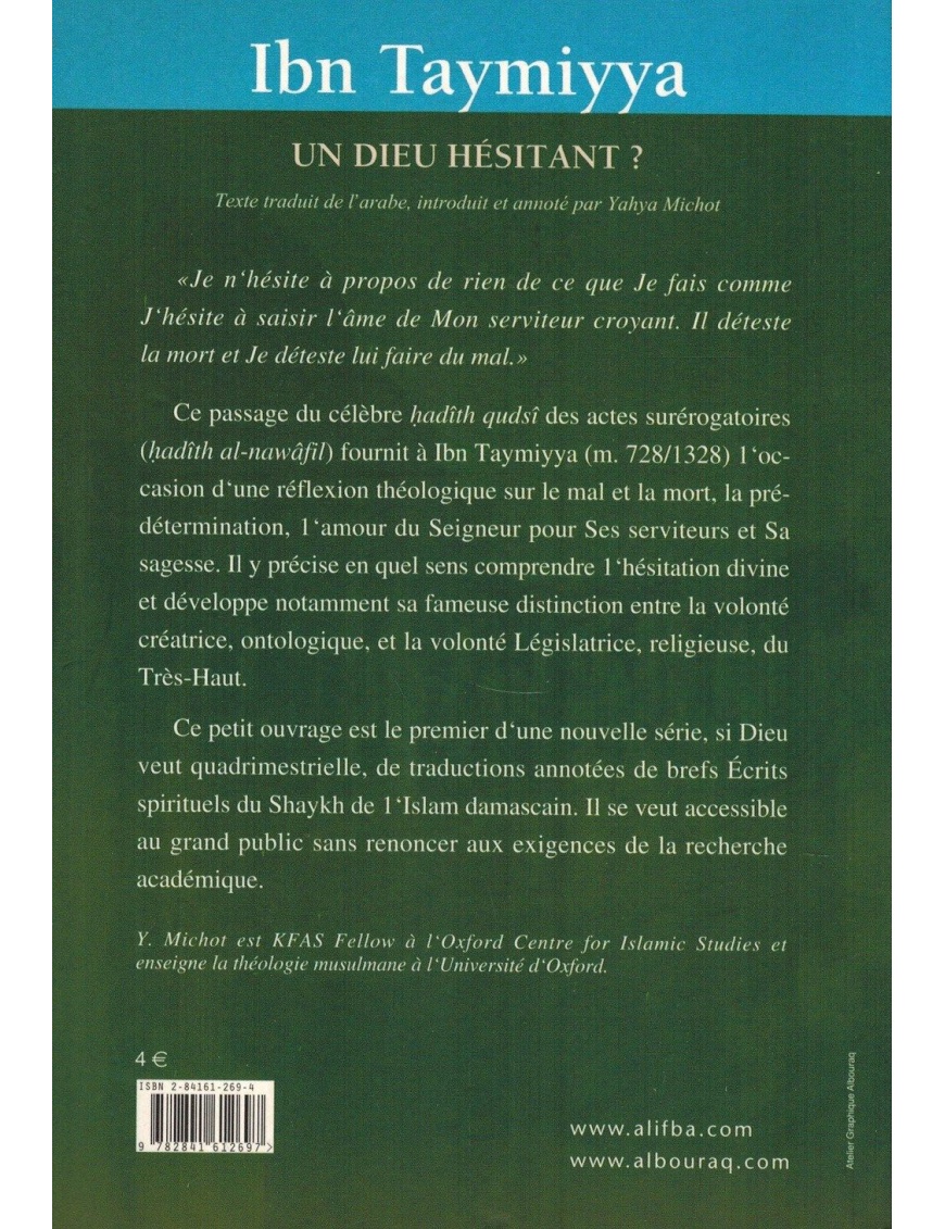 Ce passage du célèbre hadîth qudsî des actes surérogatoires (hadîth al-nawâfil) fournit à Ibn Taymiyya (m. 728/1328) l’occasion d’une réflexion théologique sur le mal et la mort, la prédétermination, l’amour du Seigneur pour Ses serviteurs et Sa sagesse. Il y précise en quel sens comprendre l’hésitation divine et développe notamment sa fameuse distinction entre la volonté créatrice, ontologique, et la volonté Législatrice, religieuse, du Très-Haut.