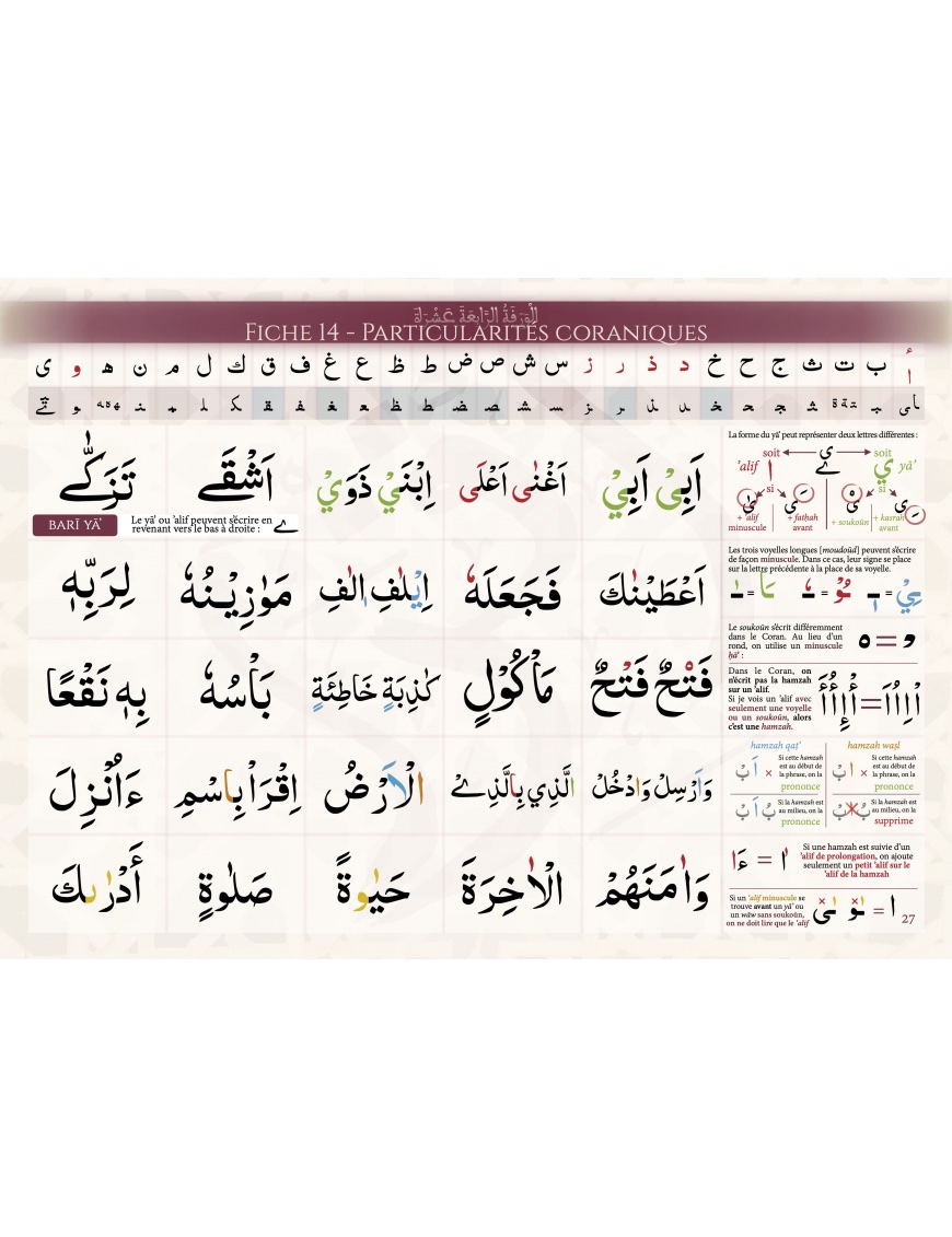 Cette méthode se distingue par son utilisation de la calligraphie Nasta‘liq et orthographe indo-pakistanaise avec notamment ses fiches 14 et 15 adaptées aux spécificités du ḍabṭ [écriture] coranique. Ainsi, dès les premières leçons, l’apprenant établit les bases nécessaires pour aborder le muṣḥaf (support coranique) dans un style calligraphique qui crée un lien naturel et fluide entre l’apprentissage initial de la lecture et l’accès au Saint Coran.